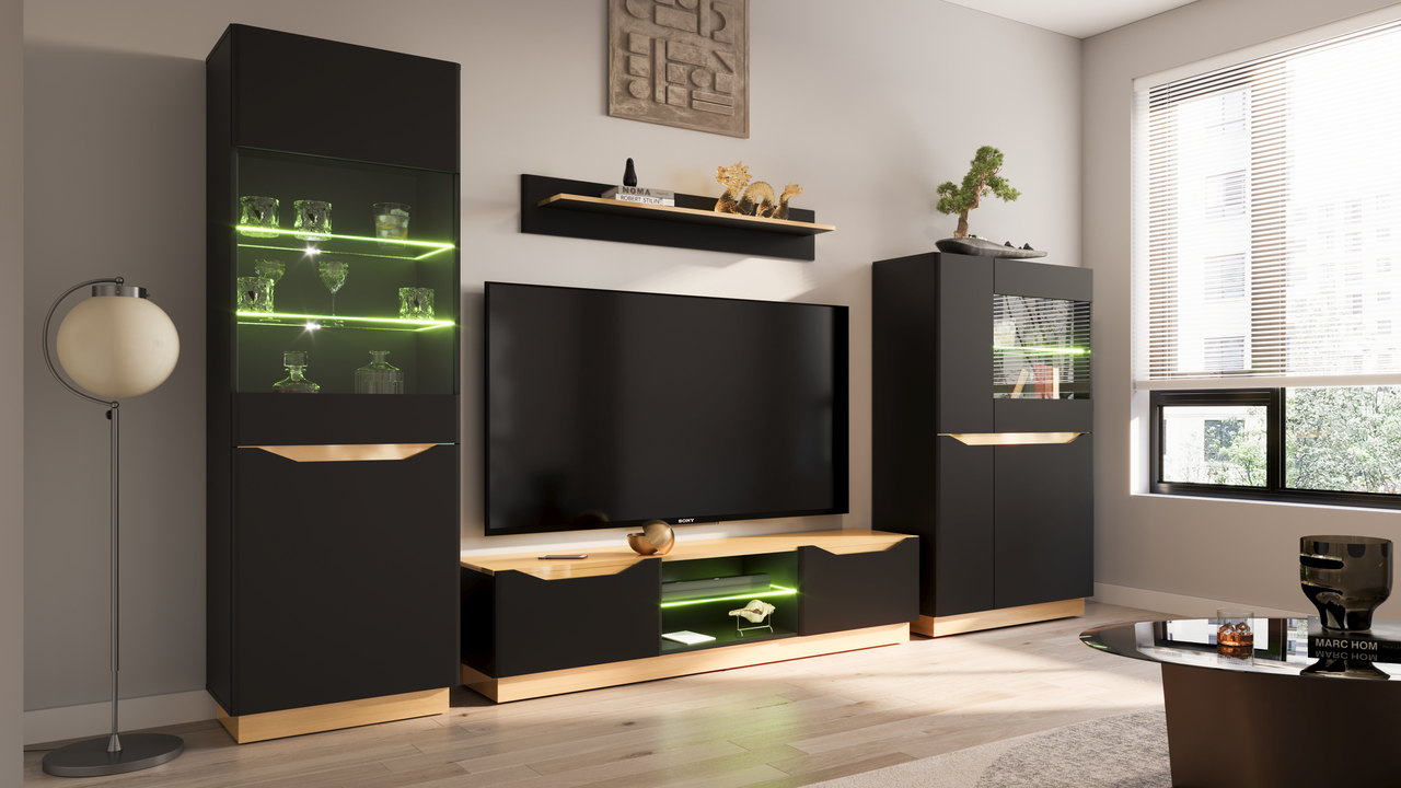 Meblościanka Lugo w wersji czarny mat ze złotymi akcentami to kwintesencja nowoczesnej elegancji. Czarne matowe wykończenie nadaje meblom luksusowego wyglądu, a złote detale wprowadzają nutę wyrafinowania. Ta wersja meblościanki doskonale sprawdzi się w nowoczesnych wnętrzach, gdzie stanowić będzie nie tylko funkcjonalny element, ale również designerski akcent. Przemyślany układ półek i szafek zapewnia optymalną przestrzeń do przechowywania oraz eksponowania dekoracji.