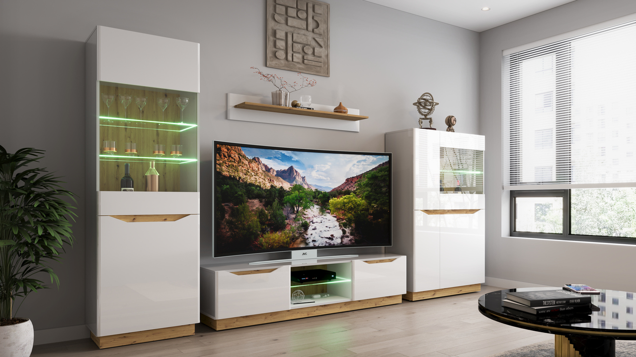 Meblościanka Lugo w wykończeniu biały połysk i dąb artisan to doskonałe połączenie nowoczesnego designu z naturalnym ciepłem drewna. Dzięki swojej uniwersalnej kolorystyce, idealnie wkomponuje się w każde wnętrze, dodając mu elegancji i świeżości. Gładkie, białe fronty w połysku nadają wnętrzu lekkości, podczas gdy elementy z dębu artisan wprowadzają przytulność i naturę.