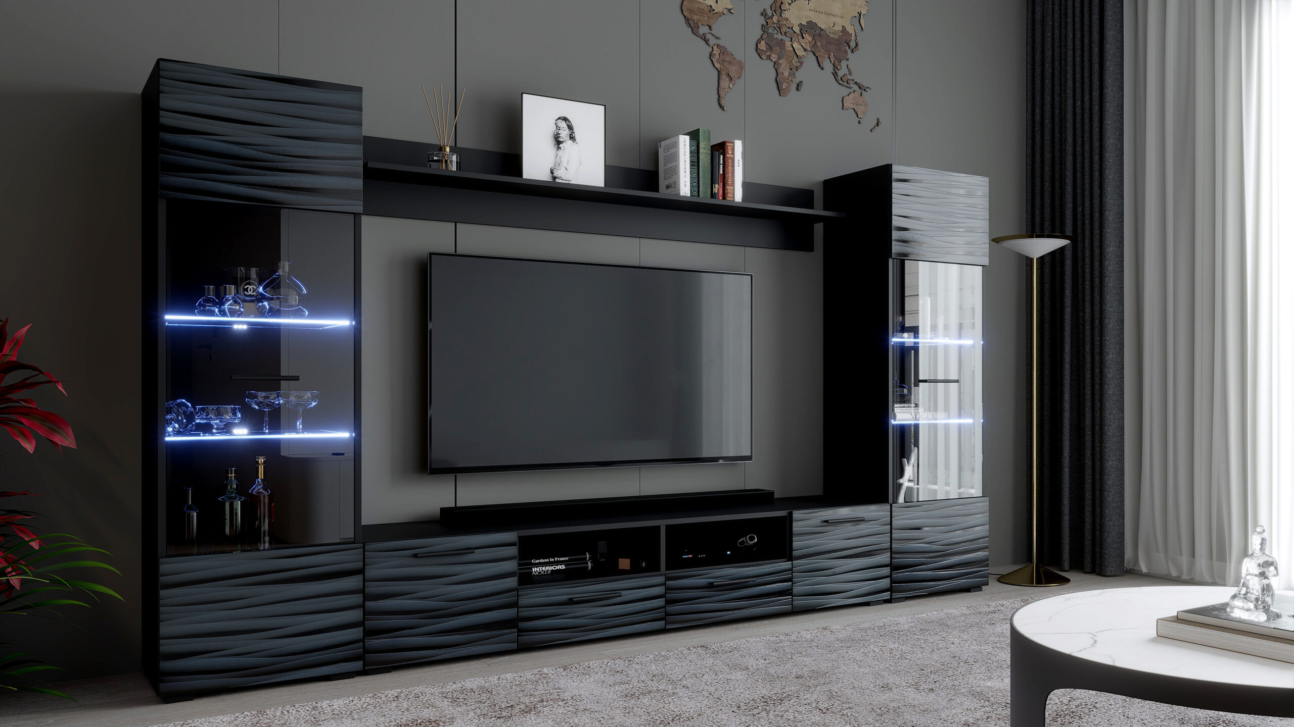 Meblościanka Parla to nowoczesna, czarna meblościanka z efektem 3D. Meblościanka Parla będzie doskonałym wyborem dla osób, które pragną wprowadzić do swojego wnętrza nowoczesny, elegancki styl z nutą futurystycznego designu. Wysoki połysk frontów nadaje elegancji i luksusowego charakteru, czyniąc tę meblościankę wyjątkową propozycją dla miłośników nowoczesnych rozwiązań.