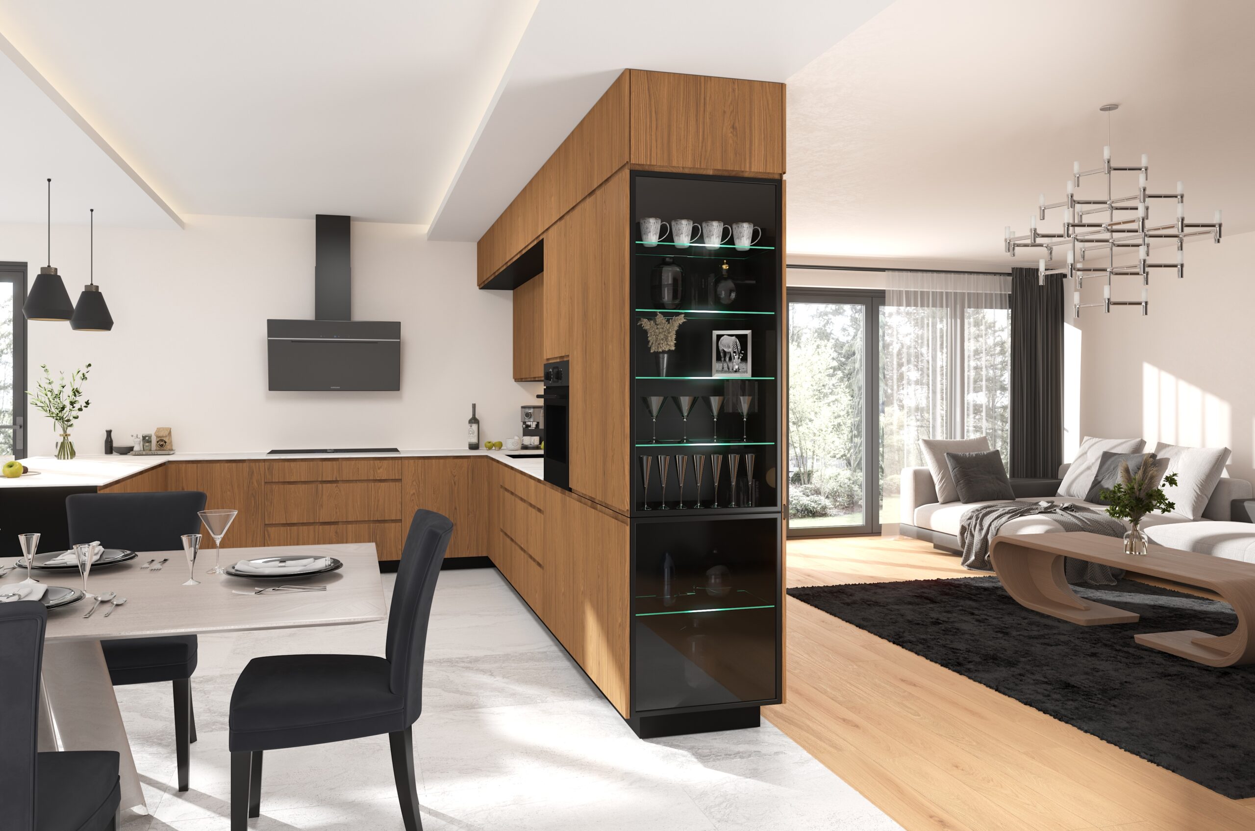 Prezentujemy kolejną aranżację kuchni z kolekcji TREVISO w ponadczasowym kolorze DĄB CASELLA BRĄZOWY. Ta wyjątkowa realizacja została wzbogacona o nową, designerską witrynę z podświetlanymi półkami.