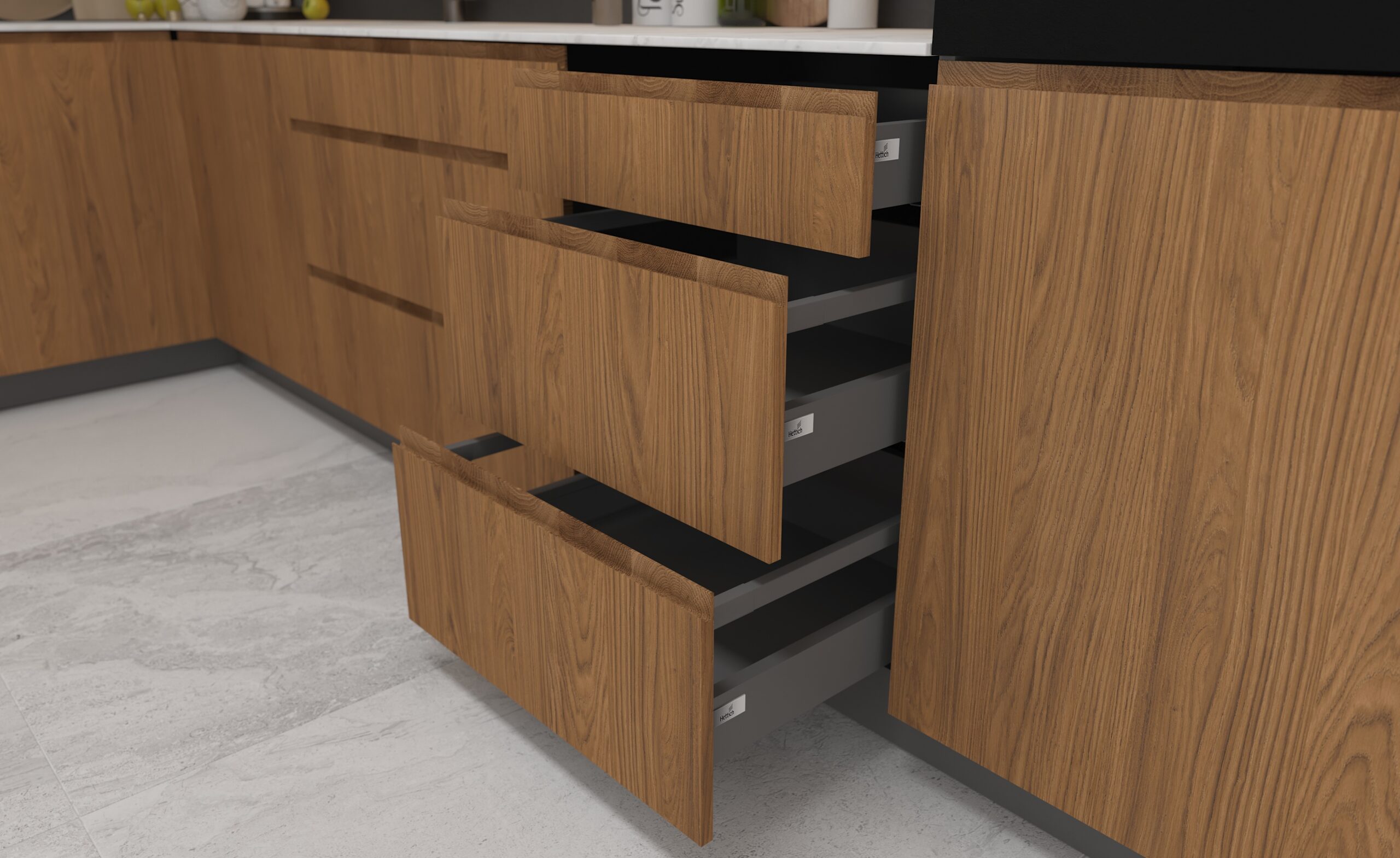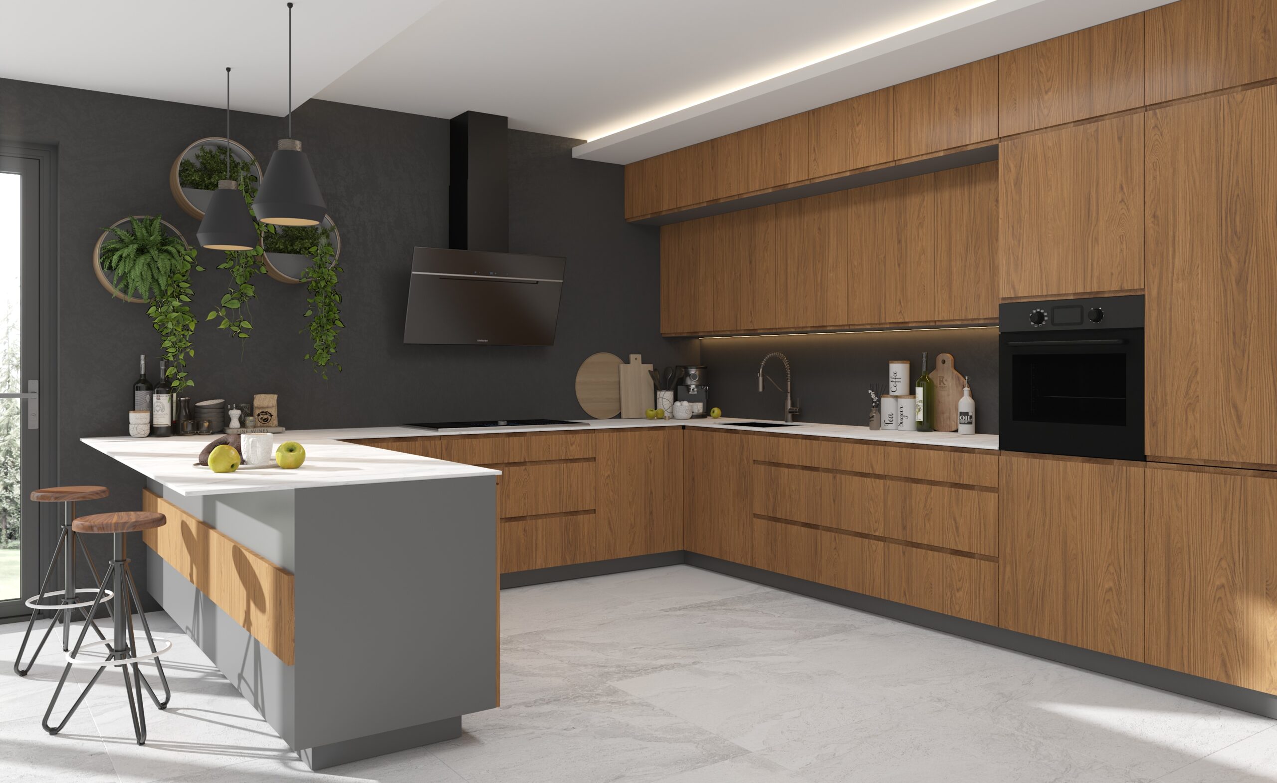 Dzięki zastosowaniu nowoczesnej technologii udało się uzyskać efekt naturalnych słojów i realistycznej faktury drewna, co nadaje frontom autentyczny, ciepły wygląd, idealnie wpisujący się w aktualne trendy wnętrzarskie.